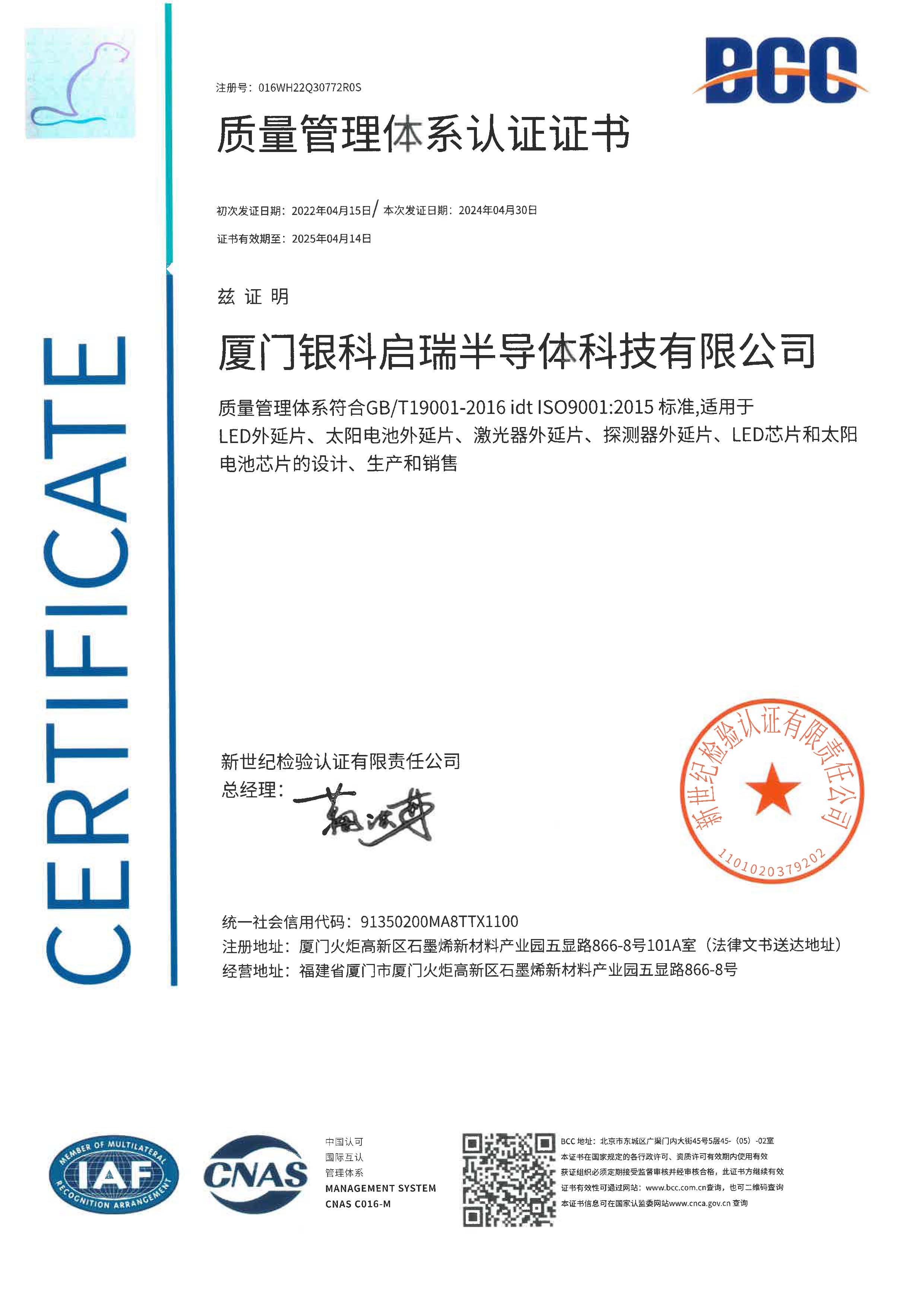 公司拥有数十台国际最先进的MOCVD外延生长设备及配套芯片设备。管理科学化、生产精益化,银科启瑞已迅速通过IS09001质量管理体系及国家级高新技术企业认证。凭借产品卓越的均匀性、一致性、可靠性,加之量产的稳定性和极强的成本优势,公司产品迅速得到市场主流客户认可,目前已远销海内外多个国家和地区。
